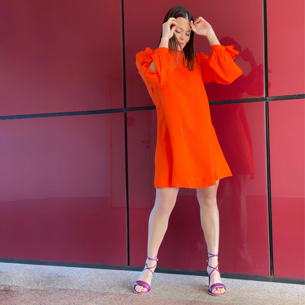 Descubra a elegância desta sandália de salto cilindro com tiras soft que amarra no calcanhar fechado, garantindo firmeza e conforto. O mix de cores vibrantes em laranja e roxo traz um toque moderno e cheio de personalidade para o seu visual.